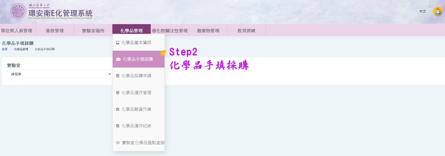 (2)游標移到化學品管理,下拉選單中選擇「化學品手填採購」